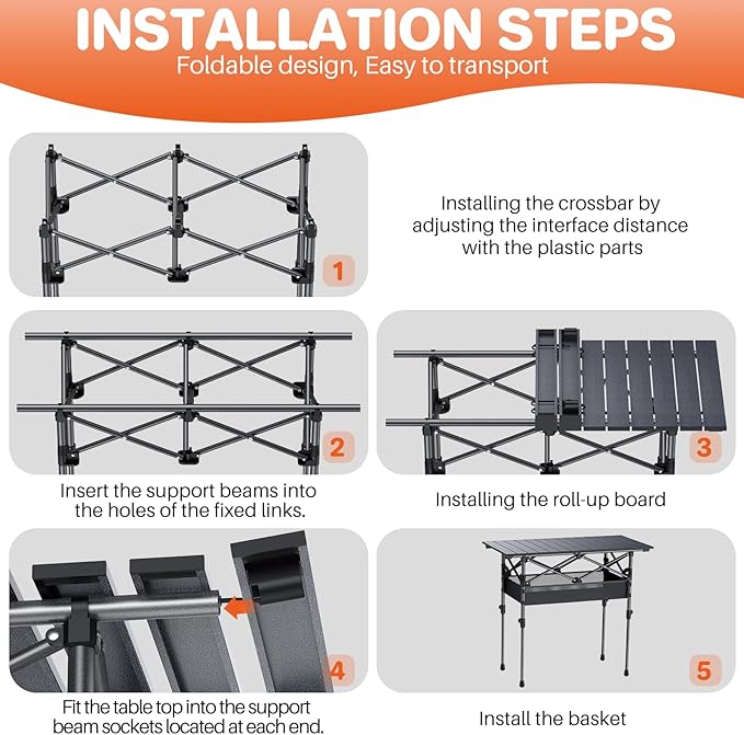 - 【Premium Materials】The camp table is crafted with a waterproof and stain-resistant aluminum tabletop and reinforced steel legs, this table is built to withstand the elements. Whether it’s rain, sand, or dirt, it’s easy to clean and maintains its sleek appearance. The sturdy steel frame ensures stability and durability
