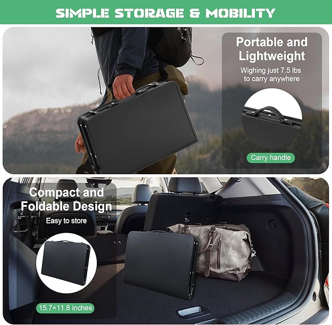 - STURDY & STABLE This outdoor folding table is built with reinforced triangular supports, a durable metal tabletop, and 4 secure latches for unbeatable stability. Unlike other tables with weak plastic joints, ours features all-metal leg connections for extra strength and long-lasting performance. Lightweight at 7.5 lbs yet supports up to 120 lbs.