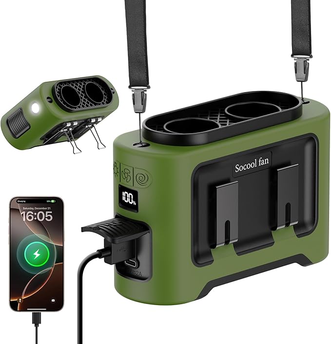 Socool 14500mAh Portable Waist Fan Clip on Wearable Belt Rechargeable Personal Fan, Dual Air Outlet, 40Hrs Cooling 5-Speed Battery Operated Fans with Light, Neck Fan Hanging for Outdoor Camping Travel