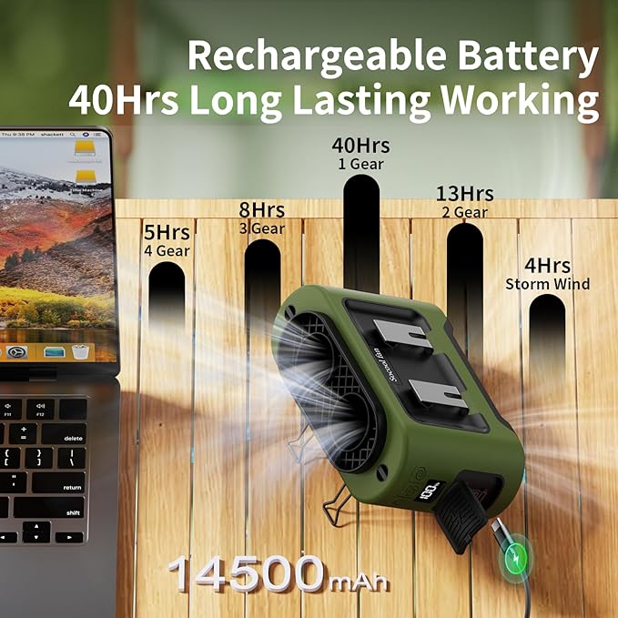 - 【Long Lasting Working Time】The waist rechargeable fan runs for up to 40 hours on low speed and takes 6.5 hours to fully charge. It lasts 4 hours on maximum wind speed and supports charging while in use, keeping you cool all day (No Standalone lithium batteries are sold with the product)