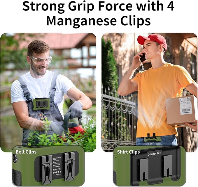 - 【Belt Fan with 4 Manganese Clips & Silicone Cover】The Portable Cooling fan includes two belt clips and two shirt clips, providing enhanced grip strength. The practical design with four clips facing opposite directions allows for versatile placement options as well as a high-quality protective silicone outer cover design for protecting against shocks and drops