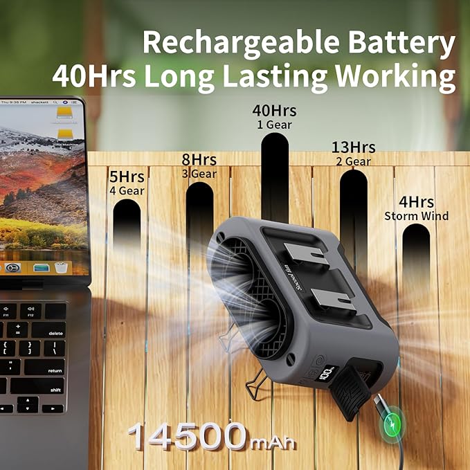 - 【Long Lasting Working Time】The waist rechargeable fan runs for up to 40 hours on low speed and takes 6.5 hours to fully charge. It lasts 4 hours on maximum wind speed and supports charging while in use, keeping you cool all day (No Standalone lithium batteries are sold with the product)
