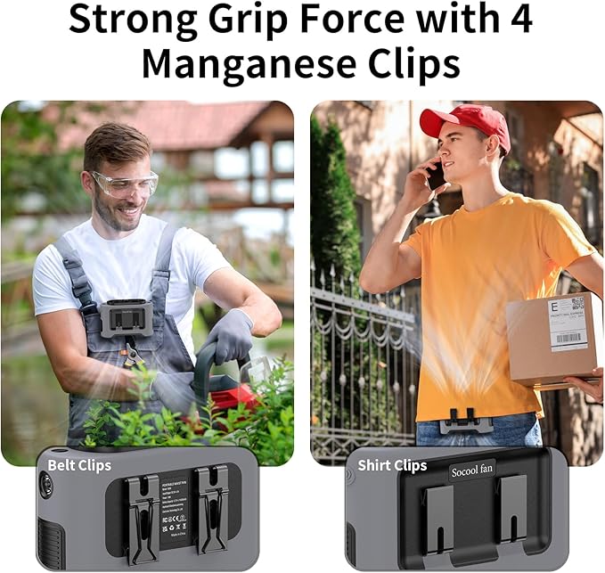 - 【Belt Fan with 4 Manganese Clips & Silicone Cover】The Portable Cooling fan includes two belt clips and two shirt clips, providing enhanced grip strength. The practical design with four clips facing opposite directions allows for versatile placement options as well as a high-quality protective silicone outer cover design for protecting against shocks and drops