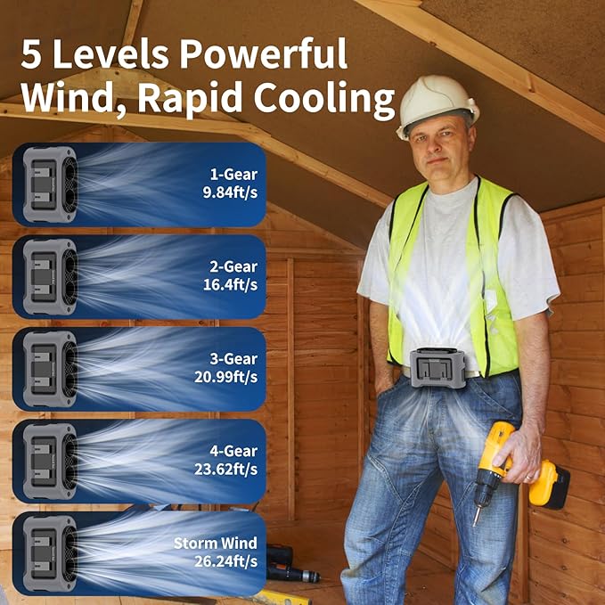 - 【5 Levels Power Wind & Dual Motors】Equipped with dual hight-speed turbo motors, the personal waist fan can reach a maximum speed of 14600 RPM, generating airflow up to 26.24 ft/s and an air supply distance of 11.48 ft. With five adjustable speed settings, from natural to gust, it’s perfect for construction workers who need powerful cooling in high temperatures