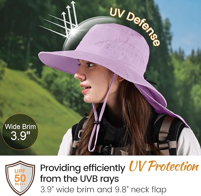 - Sun Protection UV Hats: This safari hat is made of high-quality Nylon, lightweight and waterproof; soft and durable; comfortable and UV protection. The 3.9” wide brim and 9.8” neck flap can protect your face, ears and neck efficiently from the sunburn.
