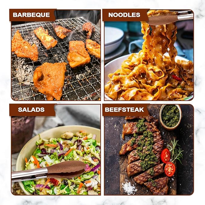 - Elegant & Versatile: Kitchen tongs for cooking with wooden tips, the sleek stainless steel and walnut wood design add style to any kitchen, while the 13-inch tongs are perfect for grilling, flipping, serving, and even buffets, making them a versatile tool for various foods.