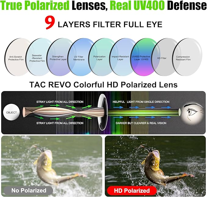 - 【Unbeatable Clarity & Eye Protection】Features high-definition polarized lenses that dramatically reduce glare from water, snow, and roads. Blocks 99.99% harmful UVA & UVB rays,safeguarding your eyes during all outdoor adventures.