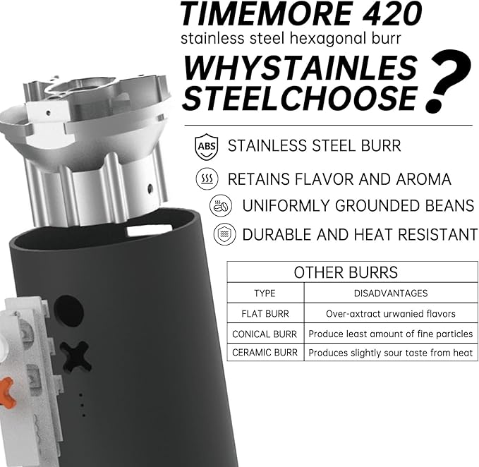 - [Patented Burrs & 20 Precision Grind Settings] - Featuring TM’s patented 420 stainless steel pentagonal burrs, the OX Grinder guarantees consistent, professional results. With 20 adjustable settings, it effortlessly adapts to espresso, moka pot, pour-over, or French press brewing—unlocking the best in every bean.