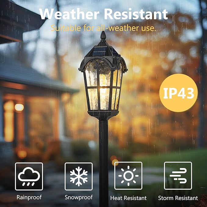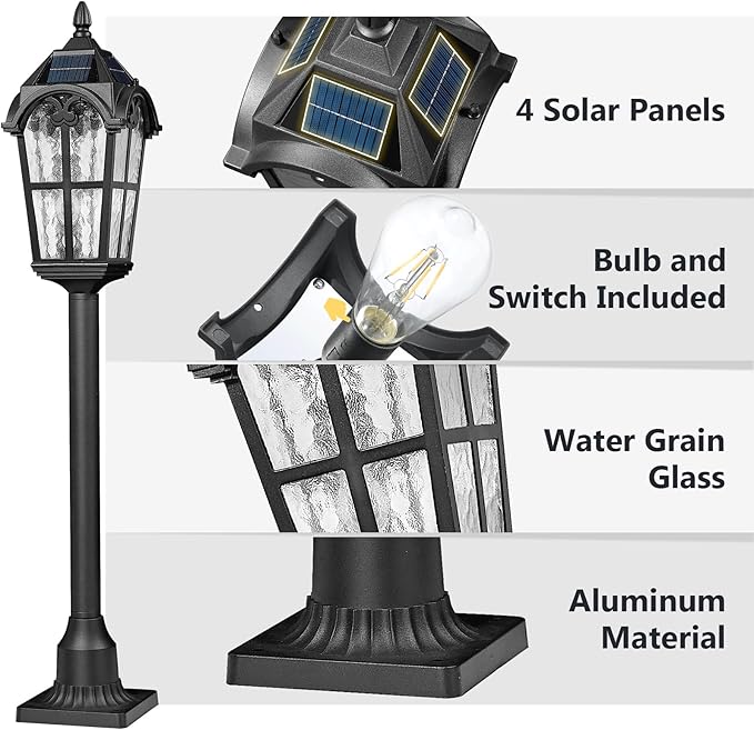 - Weather Resistant: With a waterproof rating of IP43, this post lamp is made of durable aluminum and water grain glass in a black finish, suitable for all-weather use. Comes with a 2700K LED light bulb(Max 4W). NOTE: Light source is INCLUDED and Not compatible with other LED bulbs. ONLY suitable for the ST64 LED bulbs - Asin: B0F2HWRPP9. Ideal for gardens, courtyards, patios, pathways, or any other exterior place.