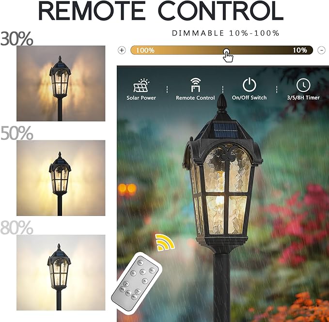 - Convenient Remote Control: Comes with a remote control, this garden post lamp automatically turns on at dusk and off at dawn. You can set timers for 3/5/8 hours and adjust brightness level from 10% to 100%, with additional options at 30%, 50% or 80%.