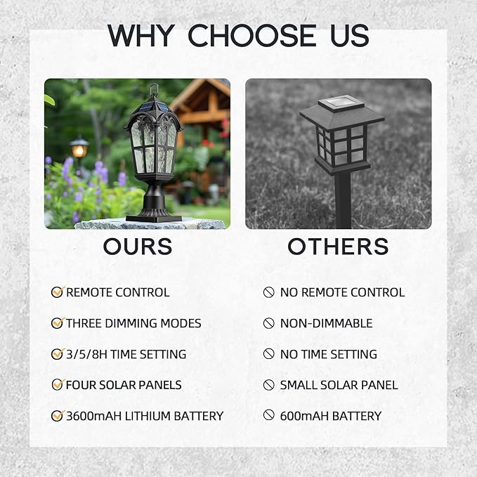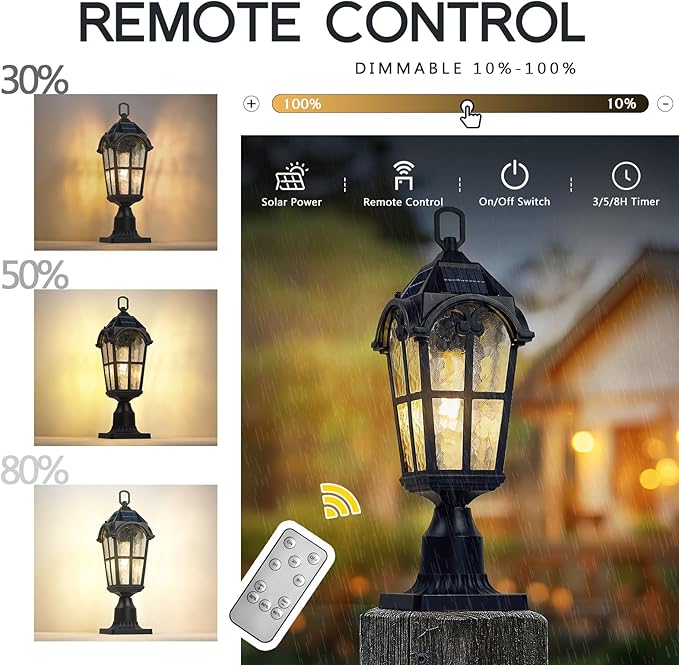 - Convenient Remote Control: Comes with a remote control, this waterproof post lantern automatically turns on at dusk and off at dawn. You can set timers for 3/5/8 hours and adjust brightness level from 10% to 100%, with additional options at 30%, 50% or 80%.