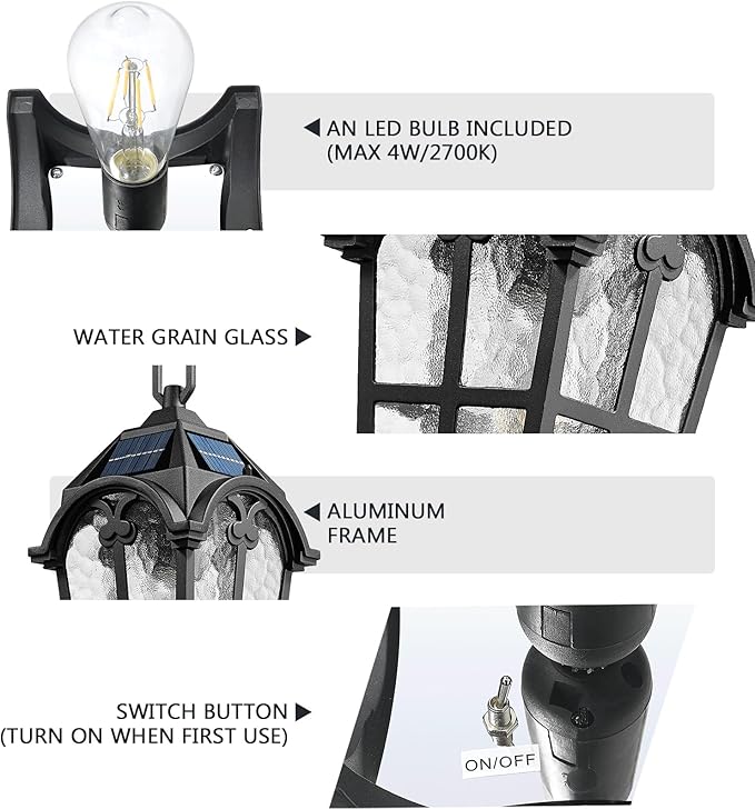 - Weather Resistant: With a waterproof rating of IP43, this post lamp is made of durable aluminum and water grain glass in a black finish, suitable for all-weather use. Comes with a 2700K LED light bulb(Max 4W). NOTE: Light source is INCLUDED and Not compatible with other LED bulbs. ONLY suitable for the ST64 LED bulbs - Asin: B0F2HWRPP9. Ideal for gardens, courtyards, patios, pathways, or any other exterior place.