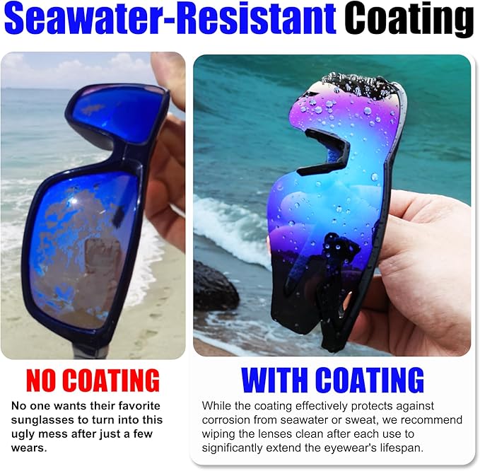 • 【Saltwater Shield Defense】Don't let the ocean stop you. Our innovative saltwater-resistant lens coating​actively fights against corrosion and degradation caused by seawater and spray, significantly extending your glasses' life whether you're surfing, sailing, or relaxing on the shore.