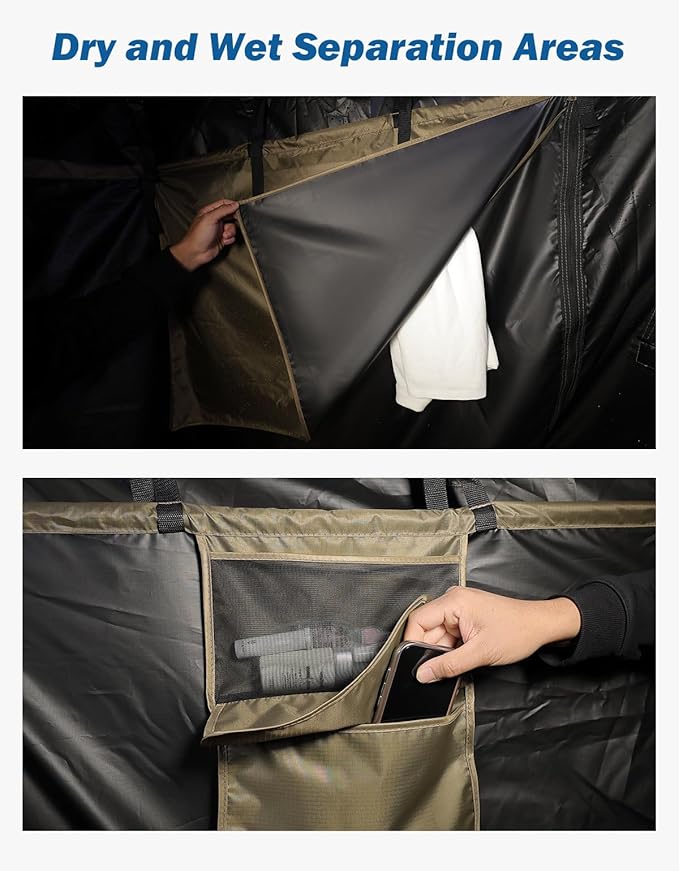 - Dry and Wet Separation Areas: Equipped with designated areas to separate dry and wet zones, this camping shower tent ensures that clean clothes and belongings remain dry. Internal storage pockets also feature dry-wet separation, making it convenient to keep personal items organized and moisture-free