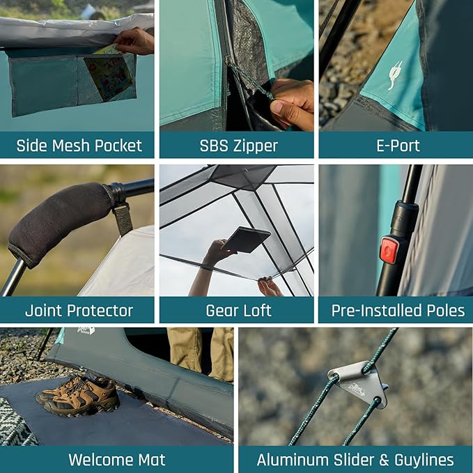 - Easy Setup & Portability: Instant tent features pre-attached poles for a faster, simpler installation. Simply extend, secure, and you're set in 60 seconds, even solo. And dismantling is a breeze, fitting neatly into a compact carry bag for easy transportation and storage. Embark on your adventures easily and conveniently! (Note: carefully read the Product User Manual and Operation Guidance Video before first use)