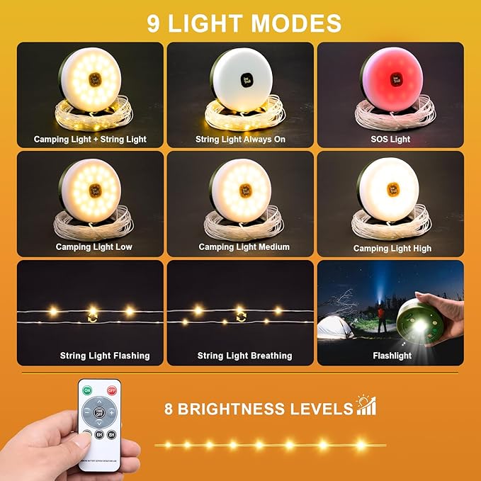 - 9 Lighting Modes + 8 Brightness Levels: Our outdoor light has 8 different lighting modes which can be remote-controlled - 1) string lights on 2)string lights quick flash 3)string lights slow flash 4) strong camping light 5) medium camping light 6) soft camping light 7) string light + camping light 8) SOS light 9) flashlight - providing the perfect ambience for every scenario. You can also adjust between 8 brightness levels using the remote and set up a timer.