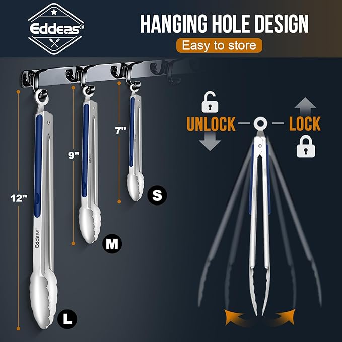 - MULTIPLE APPLICATION - Perfect for everyday kitchen tasks or outdoor use, whether you use them as cooking tongs , salad tongs, grill tongs, need reliable Heavy Duty Metal KitchenTongs for Cooking to grab food from boiling water, or as a grill Turner or salad server, EDDEAS tongs will meet your needs for safety and stability Size: 7in + 9in + 12in Set of 3 blue
