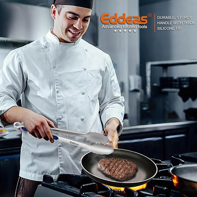 - FOOD-GRADE STAINLESS STEEL COOKING TONGS - Eddeas kitchen tongs for cooking are made of 1mm thick food-grade stainless steel in one piece for enhanced robustness and heat resistance, rust resistance and easy handling. The overall light weight and ergonomic features are maintained.