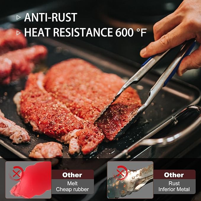 - HEAT RESISTANT ERGONOMIC HANDLES - Tongs For Cooking have ergonomic handles with silicone cushioning to ensure good grip and control, avoid burns and provide greater comfort. The metal tongs are super heat resistant and easy to clean, simply hand wash or put in the dishwasher.