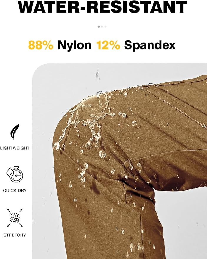 • Water and Stain Resistance: Water-resistant and quick dry fabric wicks moisture to keep your skin dry & comfortable all day. These hiking pants could get dirty and just wipe away the dirt, washed well and dries quickly