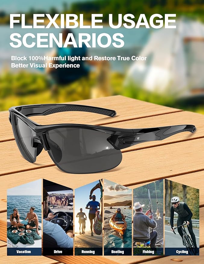 - UV400 Protection: Our sports sunglasses are equipped with HD polarized TAC lenses that provide complete protection against harmful UVA, UVB rays, and blue light, while effectively reducing glare. These lenses help keep your eyes safe and comfortable, even in the brightest conditions. Built to last, both the lenses and frames are impact-resistant, scratch-resistant, flexible, durable, and virtually unbreakable.