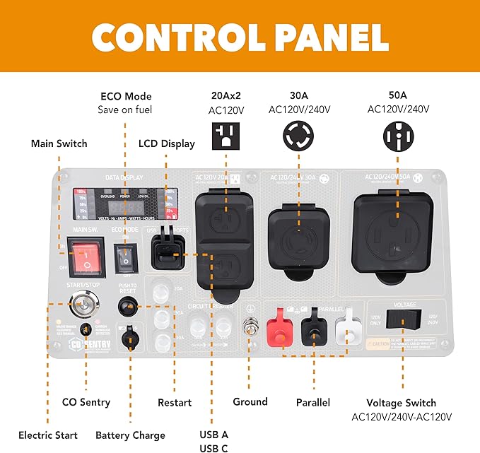 - 【Low Oil Shutdown & CO Sentry】Automatically turns off the engine when oil levels are too low, preventing damage and ensuring reliable performance by maintaining proper lubrication. Equipped with a CO sensor to automatically shut off the generator when harmful carbon monoxide levels are detected, ensuring safe operation.