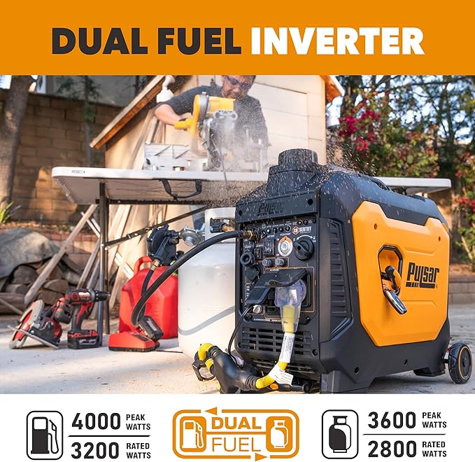 - 【Dual Fuel & Inverter】Offers 4000 peak/3200 running watts on gasoline , 3600 peak/2800 running watts on propane, with up to 6 hours runtime at half load. Its clean, stable power is ideal for electronics, and the compact design is perfect for home, camping, or job sites.