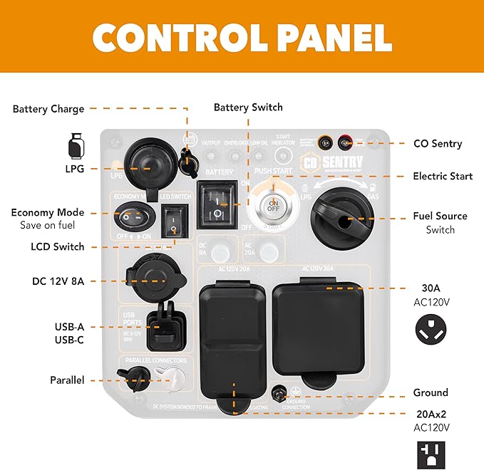 - 【Low Oil Shutdown & CO Sentry】Automatically turns off the engine when oil levels are too low, preventing damage and ensuring reliable performance by maintaining proper lubrication. Equipped with a CO sensor to automatically shut off the generator when harmful carbon monoxide levels are detected, ensuring safe operation.