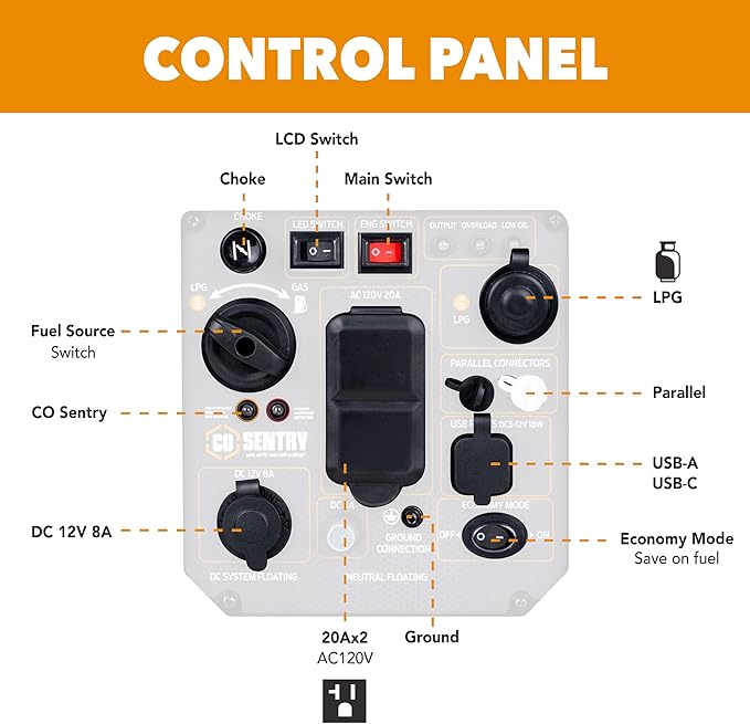 - 【Low Oil Shutdown & CO Sentry】Automatically turns off the engine when oil levels are too low, preventing damage and ensuring reliable performance by maintaining proper lubrication. Equipped with a CO sensor to automatically shut off the generator when harmful carbon monoxide levels are detected, ensuring safe operation.