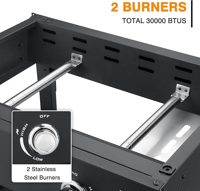 - ๐ ๐๐ฌ๐ญ ๐๐ง๐ ๐๐ฏ๐๐ง ๐๐๐๐ญ๐ข๐ง๐ -This foldable gas grill features 2 separate stainless steel burners totaling 30,000 BTUs of heat to ensure efficient and consistent heating for all your grilling needs while cooking at home or outdoors. The propane grill also allows you to create different heat zones by adjusting the burners.