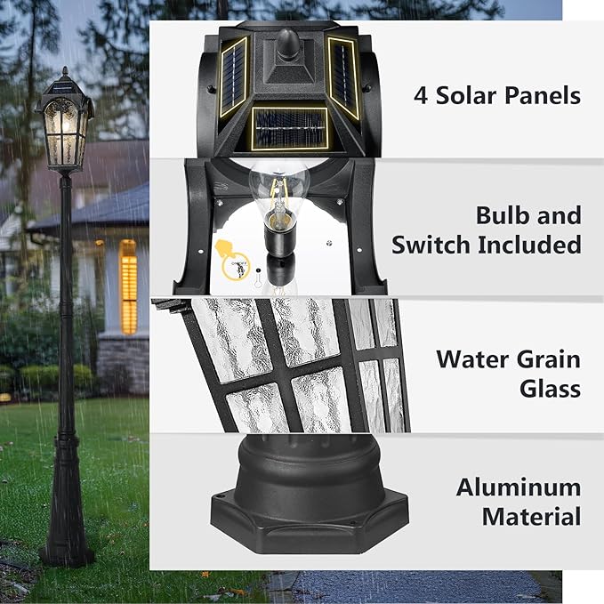 - Weather Resistant: With a waterproof rating of IP43, this post lamp is made of durable aluminum and water grain glass in a black finish, suitable for all-weather use. Comes with a 2700K LED light bulb(Max 4W). NOTE: Light source is INCLUDED and Not compatible with other LED bulbs. ONLY suitable for the ST64 LED bulbs - Asin: B0F2HWRPP9. Ideal for gardens, courtyards, patios, pathways, or any other exterior place.