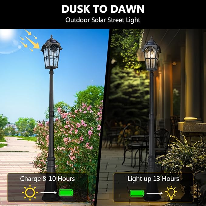 - Convenient Remote Control: Comes with a remote control, this outdoor pole light fixture automatically turns on at dusk and off at dawn. You can set timers for 3/5/8 hours and adjust brightness level from 10% to 100%, with additional options at 30%, 50% or 80%.