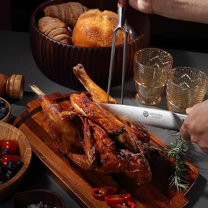 - ERGONOMICALLY WOOD HANDLE :This kitchen carving knife set features an ergonomic rosewood handle that provides a comfortable, non-slip grip. YOTSUBA slicing knife handle's natural wood grain makes each slicing knife unique, while the metal frame design and colored nail ensure good stability and balance