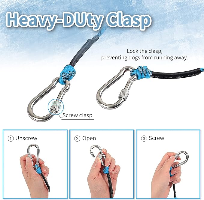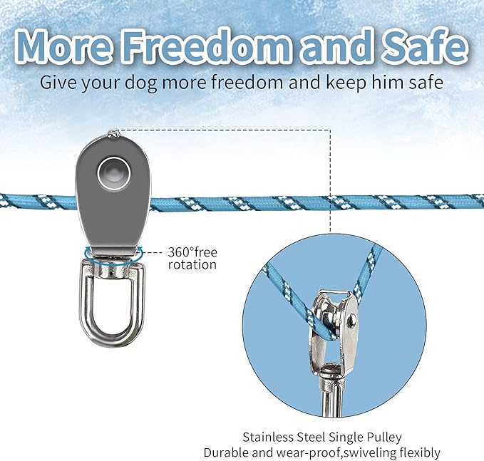 - Plenty of movement space : Our dog leash has 75 ft of camping dog leash , 10 ft of dog zipline , and 360°tangle free stainless steel single pulley to ensure that your dog has enough room for movement.