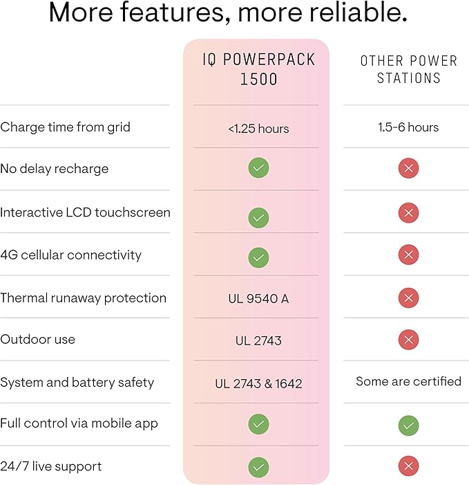 - TRUSTED PERFORMANCE: The IQ PowerPack 1500 power station with USA-designed Microinverter Technology features SyncPulse for battery checks and OTA (over-the-air) updates, is backed by 24/7 live support, and has a 5-year/2500-cycle limited coverage.