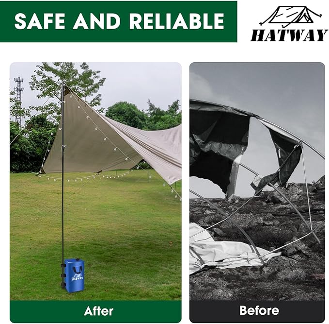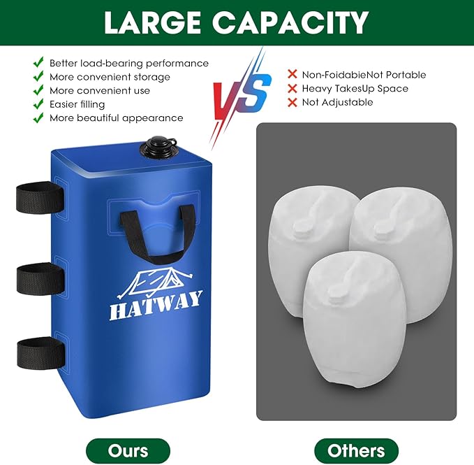 - 【Easy To Fill, Easy To Install】: Water weight for tent is easier to fill than the sandbags for tent, just fill the water bag and tie it to the legs of the tent.These tent water weights come with hook-and-loop straps, allowing you to attach it to any canopy tent legs quickly without any extra rope required.