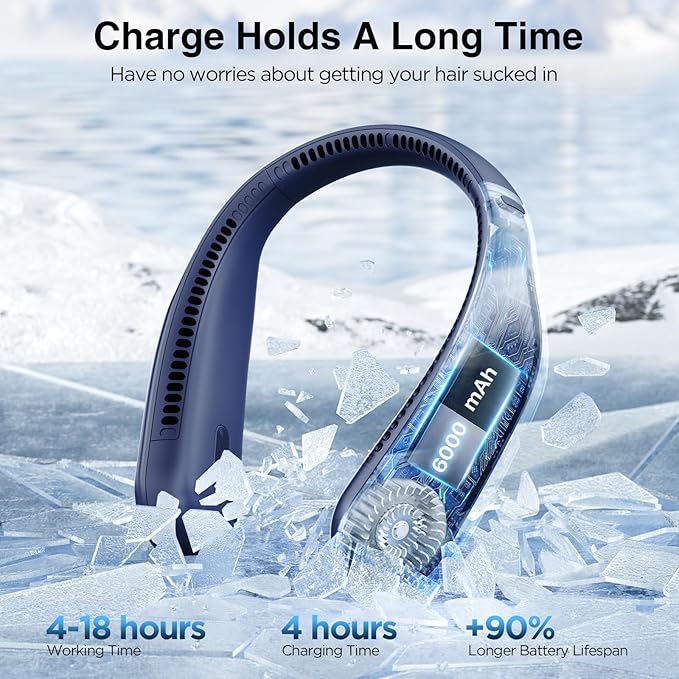 - 【Up to 18 Running Hrs & 3 Speed Settings】The neck fans that blow cool air feature 3 modes (Sleep/Comfortable/Cooling) and 3 speeds from soothing-soft to cooling-strong, you can easily adjust the air flow speed according to your comfort by simply pressing the power button. With a built-in 6000mAh rechargeable battery, the neck fan rechargeable works up to 18 hours continuously in sleep mode (at 40% volume) or 4 hours in cooling mode. A single charge lasts a long time and keeps you cool all day