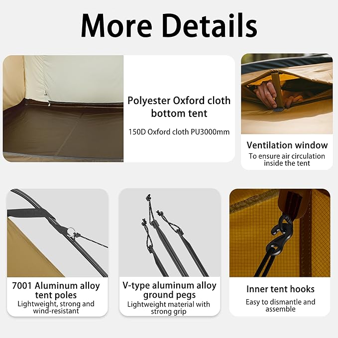 - 【Easy to Set Up】: 3 high-quality 7001 aluminum alloy tent poles are self-supporting, cross-stable and wind-resistant, at the same time, the pre-curved structure of the aluminum alloy tent poles is designed to expand the actual use space inside, it makes you enjoying a large space. Also Easy to disassemble and save your time. And removable inner tent, hall and bedroom switch at will, large space living room tent, provide comfortable space for friends to gather.