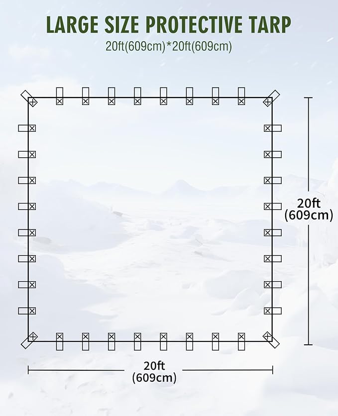 - Heavy Duty Tarp: Size 20x20 ft. HIRALIY Tarp will keep your goods undamaged from rain, snow, dirt and sunlight. HIRALIY tarp is convenient to carry and frequently use. NOTE: Please measure carefully the size of your item before purchasing to ensure that the tarp is large enough to fully protect your covered things