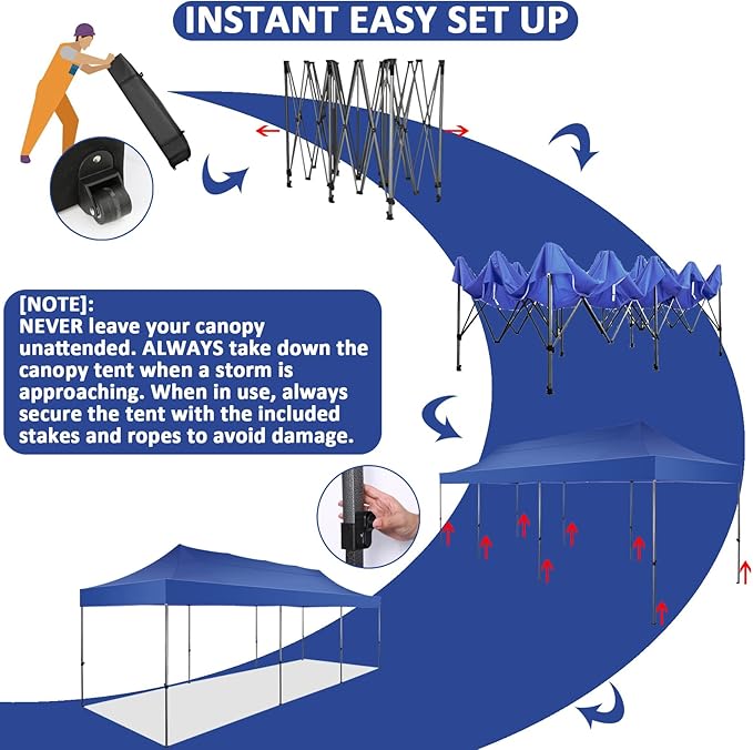 - 【300 SQ Feet Shade Area】COBIZI 10x30 pop up tent provides 300 SQFT spacious covered space, it can easily accommodate 15-20 people, meet your different needs for holding large gatherings. Perfect for wedding, birthday party, market event and other larger events. When in use, always secure the 10x30 pop up tent with the included stakes and ropes to avoid damage. One year after-sale protection for canopy frame; Six months after-sale protection for fabrics and accessories.