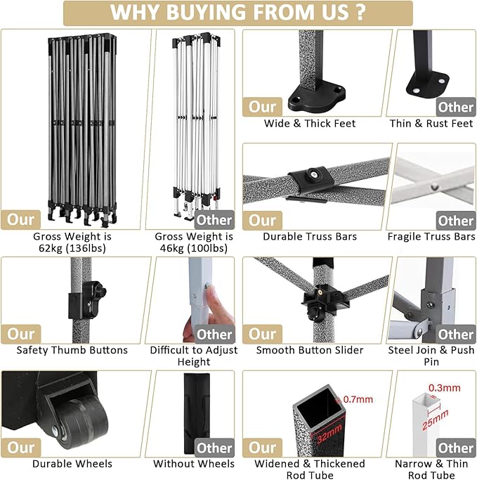 - 【3 Height Settings】10x30 pop up party tent straight leg has 3 height settings. Thumb latch lock system easy to lock and release, raise the pop up tent to a desired height. Canopy tent 10x30 straight leg height options: 220cm/86.6inch, 230cm/90.5inch, 240cm/94.5inch. Corresponding party tent center height options: 305cm/120inch, 315cm/124inch, 325cm/128inch. 10x30 canopy perfect for commercial activities, camping, festivals, tailgating, backyard events and etc..