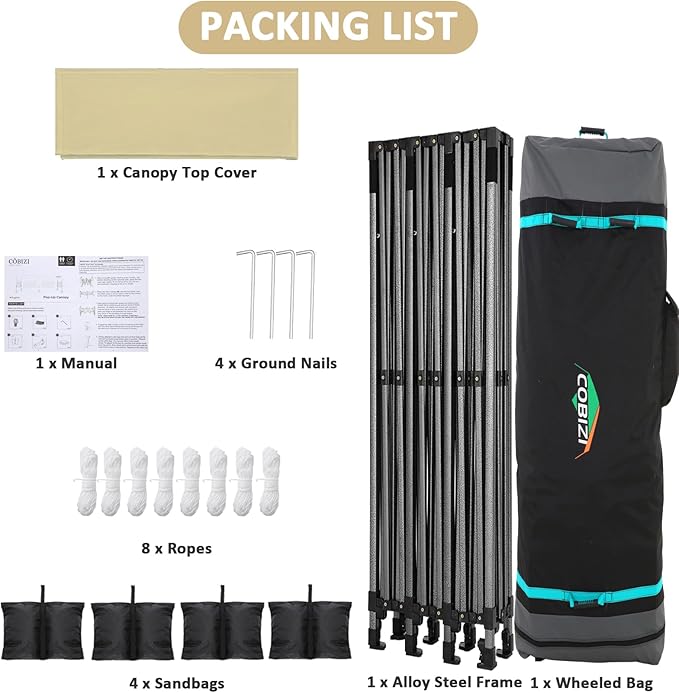 - 【300 SQ Feet Shade Area】COBIZI 10x30 pop up tent provides 300 SQFT spacious covered space, it can easily accommodate 15-20 people, meet your different needs for holding large gatherings. Perfect for wedding, birthday party, market event and other larger events. When in use, always secure the 10x30 pop up tent with the included stakes and ropes to avoid damage. One year after-sale protection for canopy frame; Six months after-sale protection for fabrics and accessories.