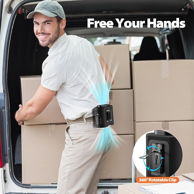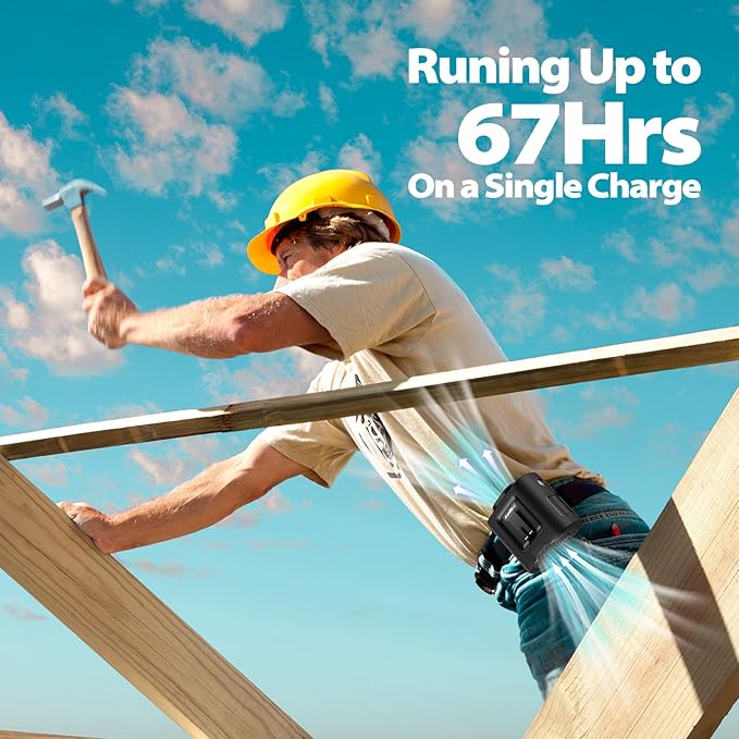 - 67 Hours Long Battery Life: This portable waist fan packs a rechargeable 14500mAh battery, delivering 6 to 67 hours cooling on a single charge. Fully recharges just in 6.5 hours, Perfect for work, job sites, camping, fishing, hiking, or travel