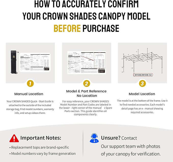 - EASY INSTALL & PORTABLE–No-fuss setup with Fast Clips and velcro straps. Lightweight replacement top (no frame) stores easily. Check your Crown Shades model (on cover bag) to confirm fit before buying!
