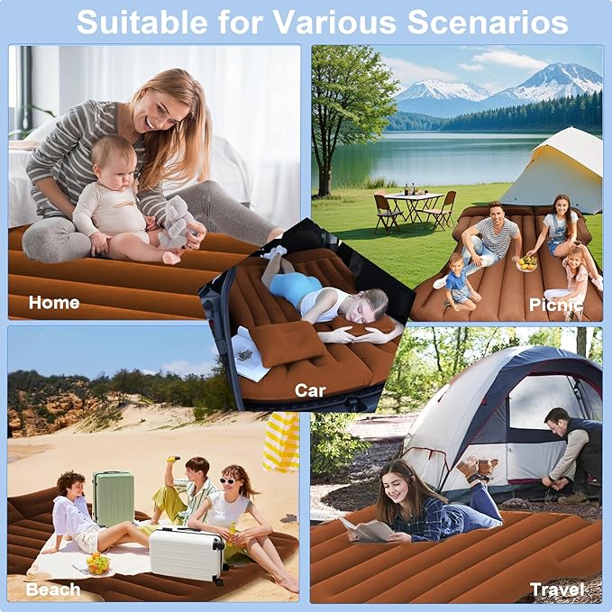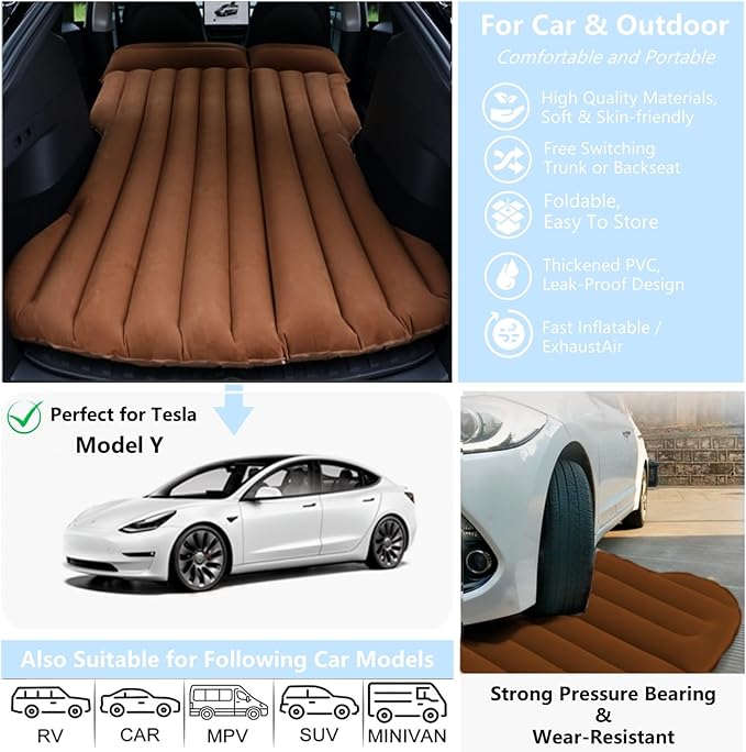 - SUIT FOR MOST CARS & MULTI-PURPOSE AIR MATTRESS : The car air mattress for tesla model y also a tent mattress for camping suit for most cars, such as SUV, MPV, truck (trunk and back seat), which is car camping essentials. The camping air mattress is versatile, including at home in the courtyard, on the balcony, in the bedroom or living room for guests, and more. It is also perfect for outdoor activities such as camping, travel, picnic, beach outings, and road trips.