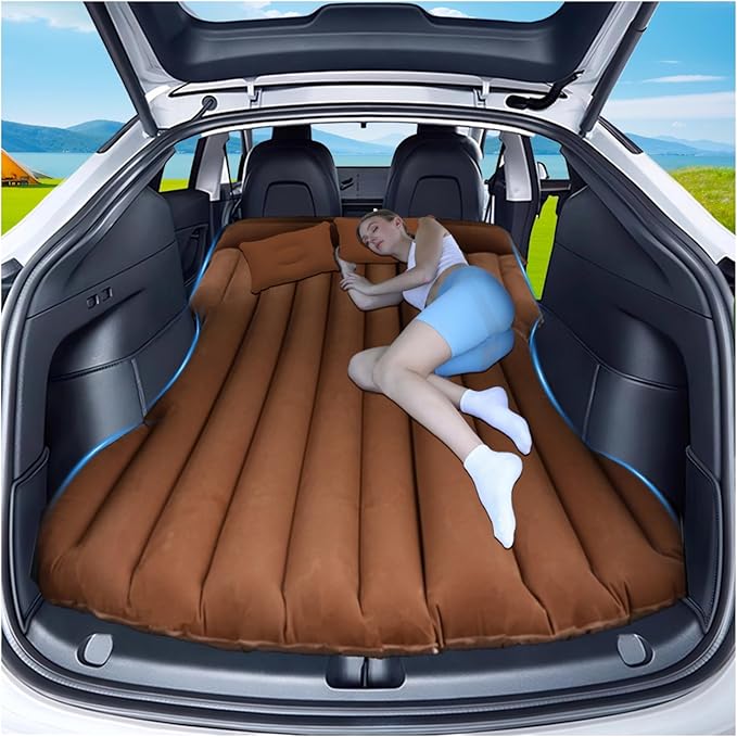 Car Air Mattress for Tesla Model Y, Camping Bed Inflatable Car Bed Mattress Fits SUV RV Truck Backseat Trunk, Portable Foldable Sleeping Pad Tent Mat for Travel Home Brown