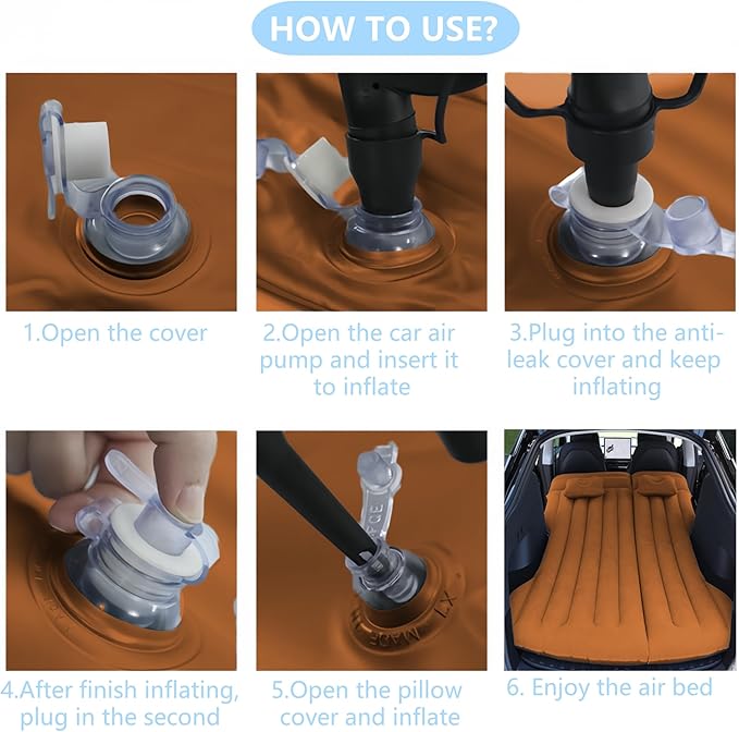 - EASY TO INFLATE/DEFLATE AND CARRY: The blow up mattress / car bed mattress come with a car air pump, which can be connected to the cigarette lighter to inflate the camping bed quickly within 2-3 minutes. When you no longer use it, you can quickly deflat and fold the air mattress, it can be easily stored in the handbag easy to carry and does not take up space. It is an ideal car sleeping mat, camping mattress pad or car inflatable bed. Perfect for night driving or overnight fishing, enjoying movie time, self-driving travel , and camping in outdoor tents.