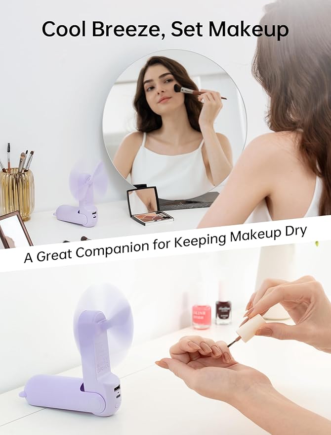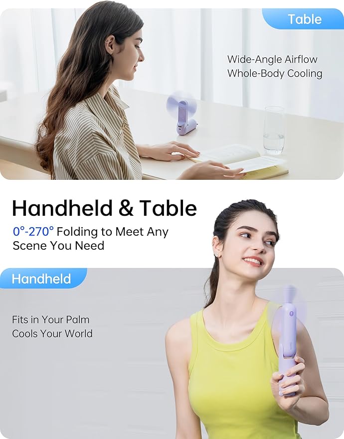 - Foldable Design and Mini Size: The folding design makes it easy to be carried and stored. Besides, with the capsule shape(5.1*1.65*1.65 inch, weight: 6.38 OZ), this rechargeable fan can hide the fan blade, small and easy to slide into your pocket and purse.Gifts choice for Christmas & New Year