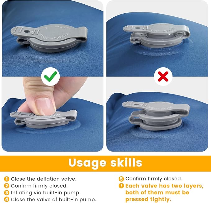 - 2. 30s Inflation Full & 1s Deflation & 24-Hour Air Keep. Single-foot pump fills the camping mattress pad in 30 seconds (tested to be 5x+ faster than hand or mouth pump style). Inflation method: Open the inflation valve, one foot steps on it, and by continuously stepping down and lifting your foot, allow air to enter the sleeping pad, achieving rapid inflation. Saves effort and protects your back. No-leak valve design keeps the inflatable sleeping pad fully inflated for 24 hours—no need to refill at night. Sleep uninterrupted. Open the valve on the camping sleeping mat back, and air instantly escapes.