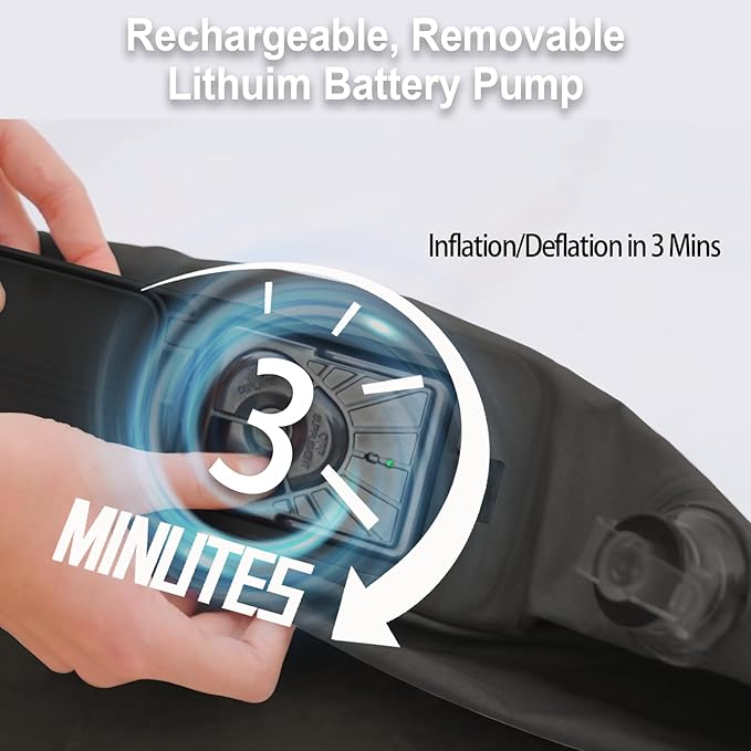 - 3-Minute Fast Inflation with Dual-Power Option:Features a built-in 1300mAh lithium battery pump (USB-C rechargeable) for cordless inflation in just 3 minutes, plus an included power cord for outlet use. The LED display clearly shows the power mode.A single charge supports multiple full inflations and deflations, making it perfect for outdoor adventures or quick indoor setup.